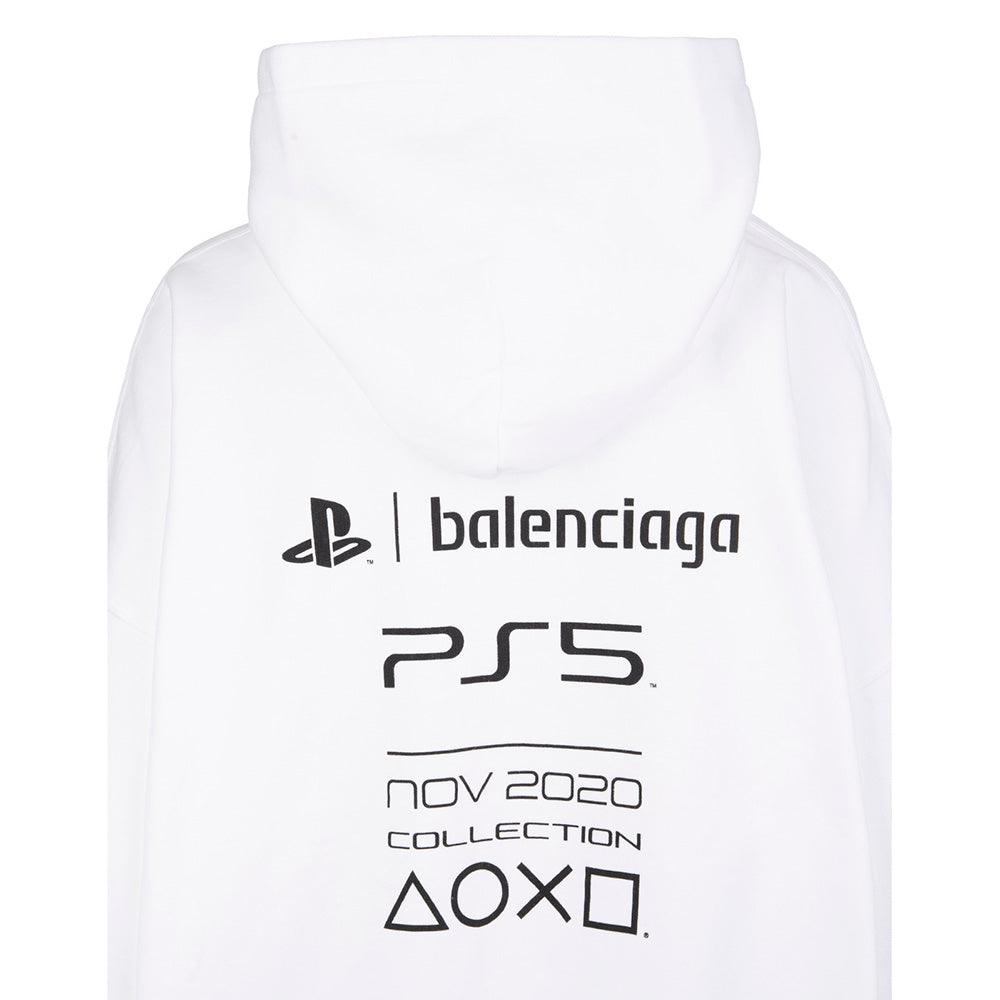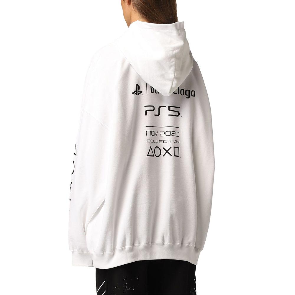 Sudadera blanca con capucha ajustable con cordón de Balenciaga x PS5. Confeccionada en punto de algodón, esta sudadera con capucha presenta un estampado gráfico negro con el logo de la marca, un bolsillo canguro y ribetes acanalados en los bordes. Ajuste extragrande. Unisexo. Fabricado en Portugal. Nuevo con etiquetas. 100% Autenticidad Garantizada.