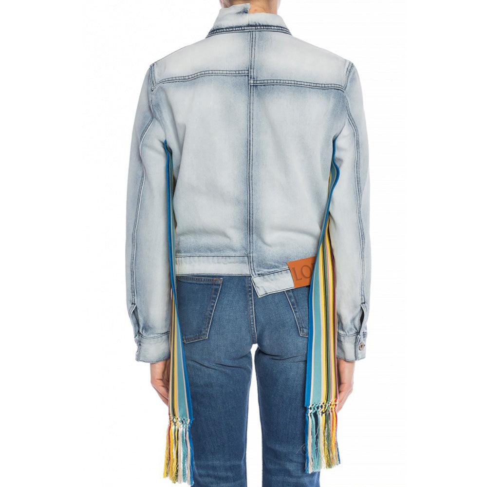 This Loewe jean jacket is made of 100% cotton and features multicolor knit stripe bands. 100% Authenticity Guaranteed. Brand new with tags.
