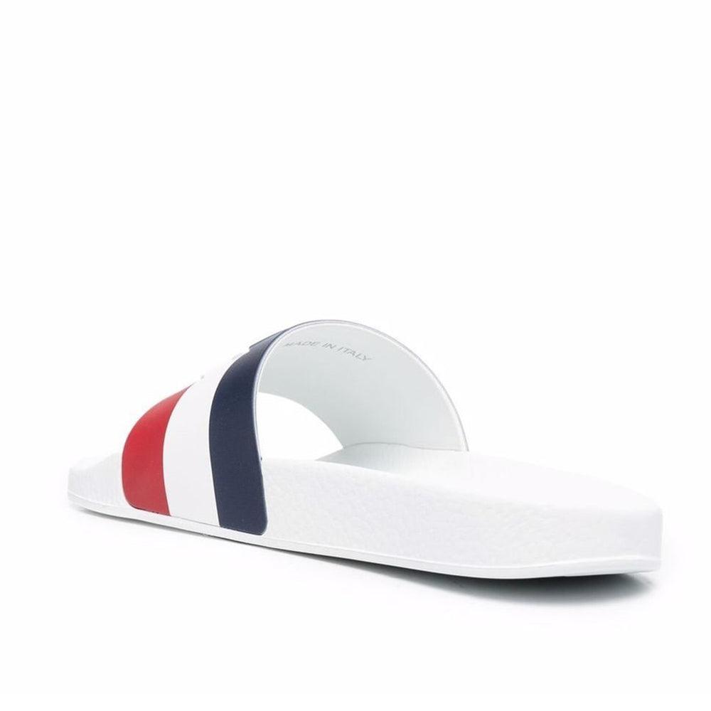 These Moncler sandals feature stripe detailing, embossed logo, open-toe, rubber sole. Made in Italy. 100% Authenticity Guaranteed. Brand new with original packaging.